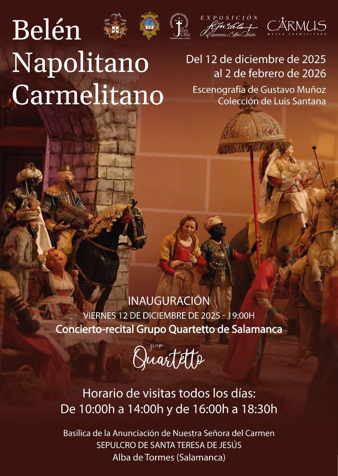 Alba de Tormes se dispone a vivir una Navidad especialmente destacada con la próxima apertura del Belén Napolitano Carmelita, una propuesta artística y espiritual que podrá visitarse del 12 de diciembre de 2025 al 2 de febrero de 2026 en la Basílica de la Anunciación – Sepulcro de Santa Teresa de Jesús. La muestra forma parte del programa cultural de la exposición sanjuanista “Esperanza de alto vuelo” y está impulsada por el Cármus – Museo Carmelita, que incorpora para la ocasión la colección privada de Luis Santana, presentada en una cuidada escenografía diseñada por Gustavo Muñoz.