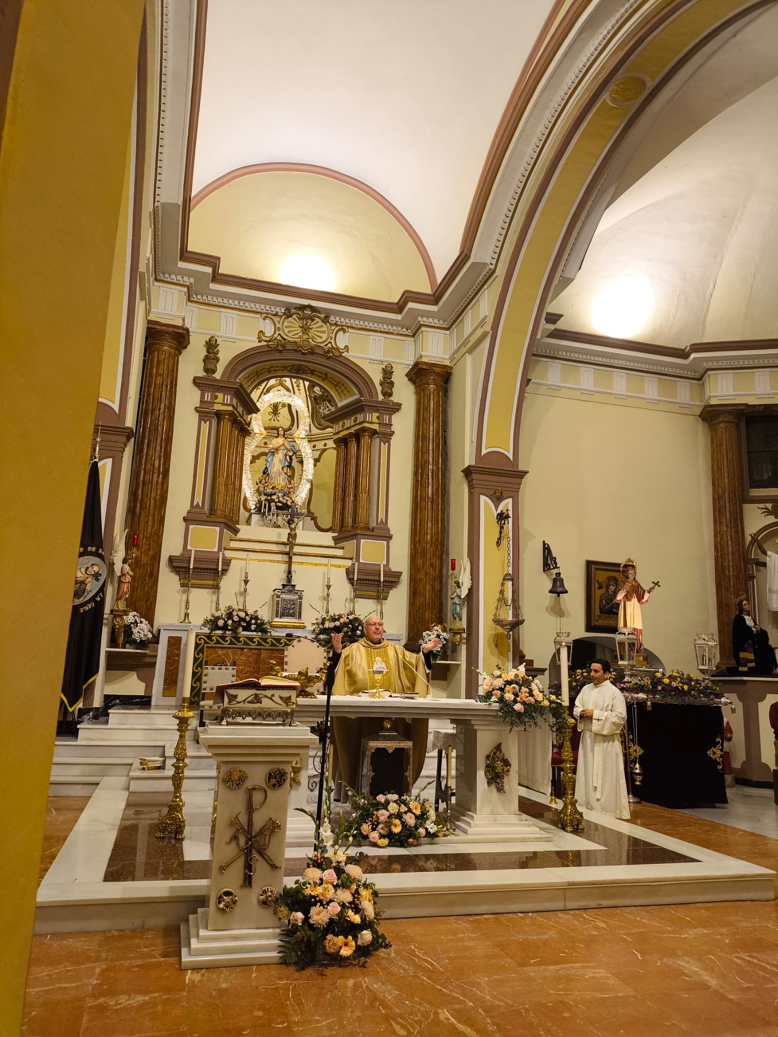 Preside el templo la bandera con la imagen del Santo, preparada para la procesión, en un trono o parihuela que saldrá a las calles mañana por la tarde. Junto a San Juan de la Cruz procesiona también San Carlos Borromeo, copatrón de la localidad, aunque su participación podría desaparecer en el futuro para dar mayor centralidad al patrón principal.