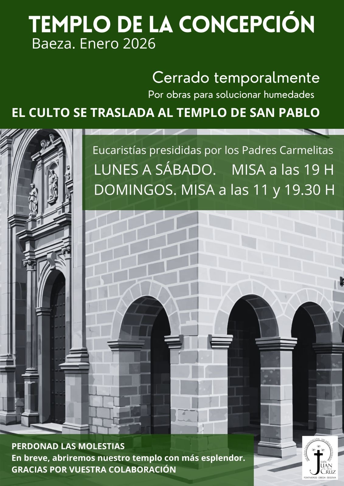 Con el deseo de no interrumpir la atención pastoral ni dejar de acompañar a las personas que habitualmente participan en la vida litúrgica de la comunidad, los Carmelitas Descalzos de Baeza, en diálogo con el párroco de la Parroquia de San Pablo —quien es, además, vicario territorial del arciprestazgo—, han acordado el traslado provisional del culto a dicho templo.
