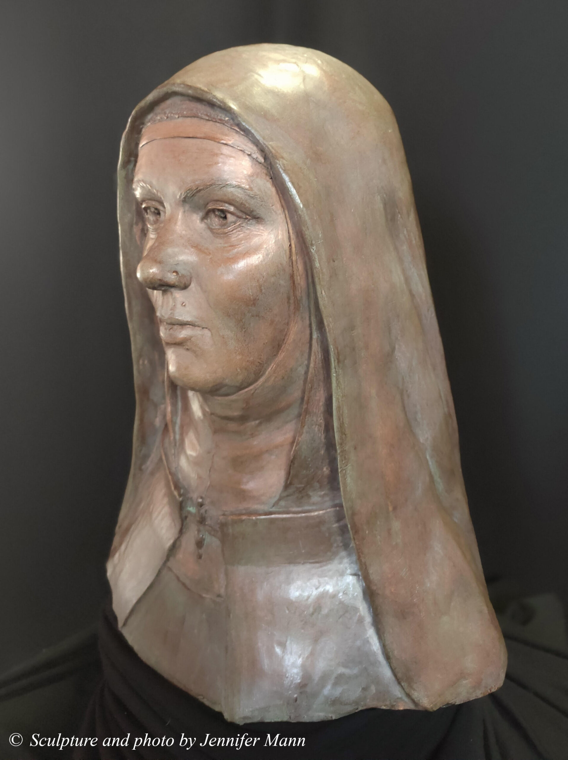 Utilizando técnicas forenses avanzadas y basándose en medidas antropométricas, radiografías, testimonios históricos y descripciones de la época, Jennifer Mann ha logrado esculpir con precisión el rostro de Teresa de Jesús, representándola con aproximadamente 50 años, edad clave en su vida espiritual y fundacional.