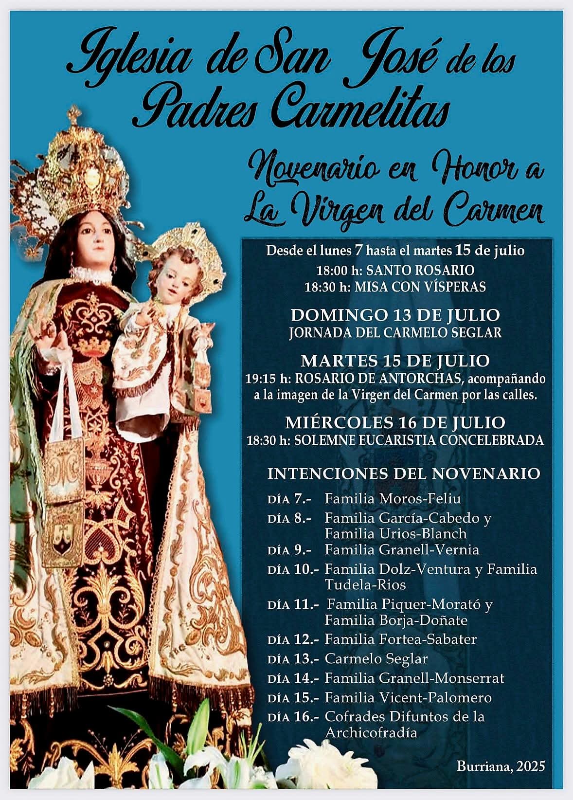 Del 7 al 16 de juliol de 2025 se celebrarà el novenari a la Verge del Carme, amb el següent programa: