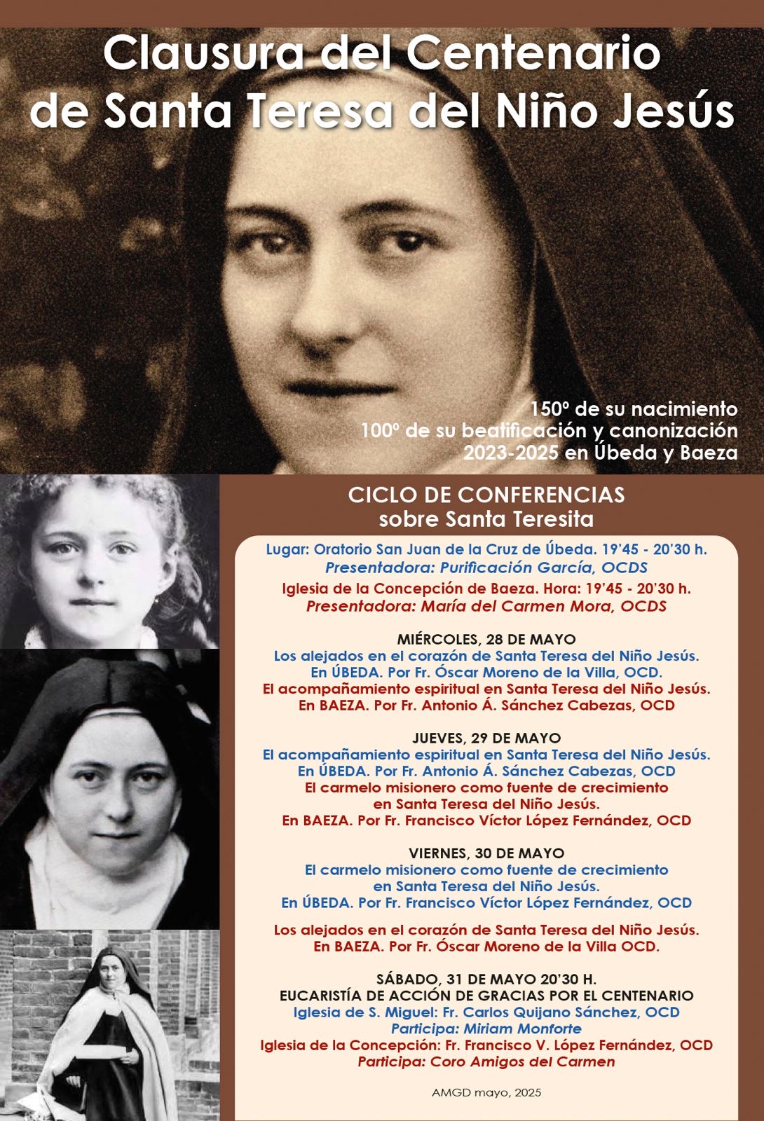Del 28 al 31 de maig de 2025, les ciutats d’Úbeda i Baeza acolliran la clausura del Centenari de Santa Teresa de l’Infant Jesús,en el marc dels 150 anys del seu naixement i el 100è aniversari de la seva beatificació i canonització. En aquest context jubilar, la comunitat de carmelites descalços ha preparat ràun cicle de conferències i una Eucaristia solemne d’acció de gràcies en reconeixent la profunditat del seu missatge i el seu testimoniatge de santedat.