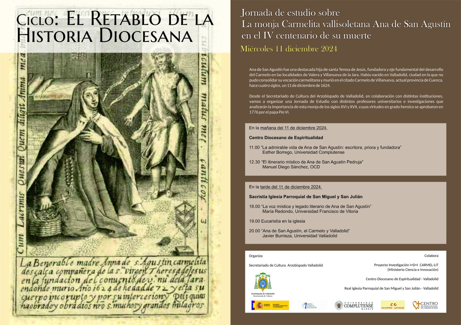 Ana de San Agustín va ser una destacada filla de santa Teresa de Jesús, fundadora i eix fonamental del desenvolupament del Carmel a les localitats de Valera i Villanueva de la Jara. Havia nascut a Valladolid, ciutat on no va poder consolidar la seva vocació carmelitana i va morir al Carmel de Villanueva, actual província de Conca, fa quatre segles, un 11 de desembre de 1624. Des del Secretariat de Cultura de l’Arquebisbat de Valladolid, en col·laboració amb diferents institucions, organitzarem una Jornada d’Estudi amb diferents professors universitaris i recerques que analitzaran la importància d’aquesta monja dels segles XVI i XVII, quines les virtuts heroiques es van aprovar el 1776 pel papa Pius VI.