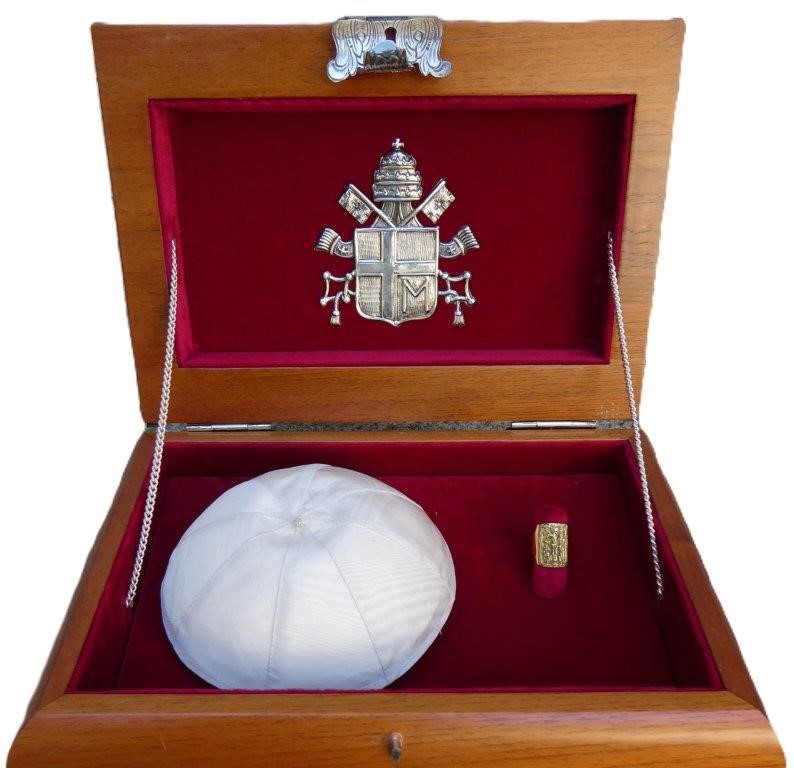 L’anell va ser lliurat a la comunitat el 2005 pel nunci de Sa Santedat, tot just dos mesos abans de la defunció de sant Joan Pau II. El solideu va arribar en 2002, de mans del secretari personal del Papa. Aquestes peces mostren el profund vincle que el Pontífex va tenir amb el Carmel teresià, que va visitar el 1982, durant el seu viatge a Espanya amb motiu del IV Centenari de la defunció de santa Teresa de Jesús.