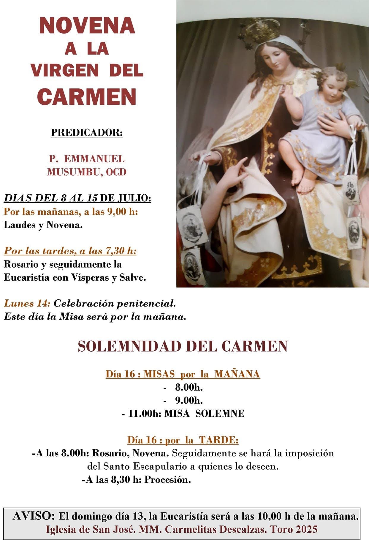 La predicació d’enguany està a càrrec del P. Emmanuel Musumbu, ocd, el qual guia els fidels en la preparació espiritual per a la gran festa. Les jornades de la novena, que se celebren del 8 al 15 de juliol, consten de l’oració de Laudes i Novena a les 9.00 h, i a la tarda a les 19.30 h amb el rosari, Eucaristia, vespres i la Salve.